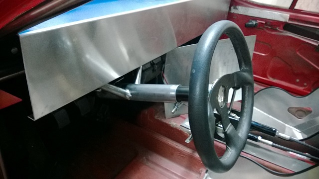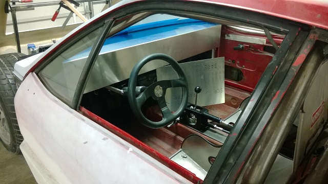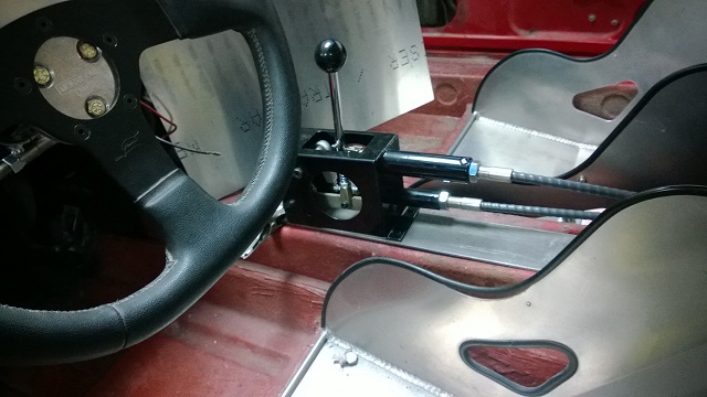 I welded a tube to the dash bar and the Speedway column slips inside. The tube has a slot and pinch bolt to secure the column. I installed the heater box—I need the defroster and heat for when I take the car on the street. I’ll weld some metal to the top of the center tunnel which is thick enough to secure the shifter box. The dash is wedged in place because I still need to weld the brackets on either end to the roll hoop. The last picture shows where the shifter cables pass through the rear firewall. The cables are about 24″ too long so I’ll need to order replacements.