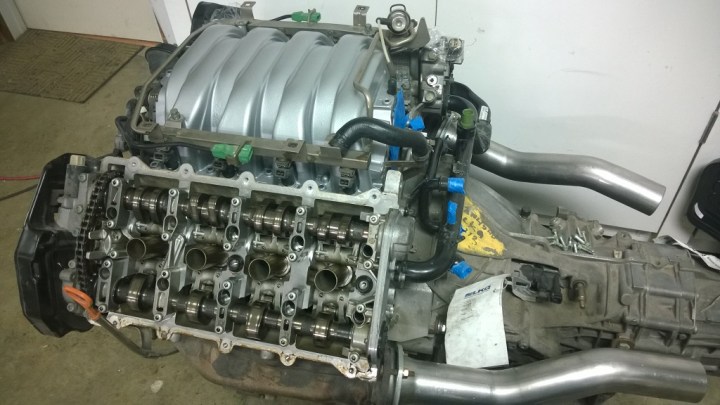 I worked on the engine again last night and assembled it as much as I could with the painted parts. I attached that mega-bracket with the filter, cooler and alternator mount and used the billet water pipe I ordered off eBay. I’ll have to find out what torque values to use. The replacement starter fits properly so I bolted it in place. When I was installing the injector rail I noticed that once side is bent and the two middle injectors don’t seat properly. I pried up in that location to pop it loose from the manifold and it must have bent. I ordered a replacement from eBay for $25 delivered. Hopefully it fits. I ordered the 2.8 30v DMF flywheel from Partsgeek. They have a 30 day return policy if it doesn’t work. The engine will look nice when the valve covers are painted crackle red. The timing belt finally shipped yesterday from ECS Tuning. I’m not replacing all the idlers because they seem fine and don’t have a lot of miles. Once the timing belt is in I’m going to crank it over with fresh oil to get everything lubricated and pressurized and ensure there are no problems with the rotating assembly. As you can see the engine is immaculate inside with no oil residue.