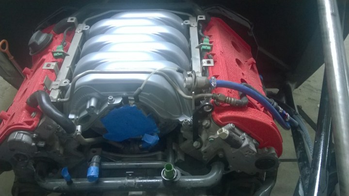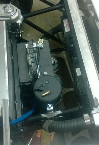 In the first two pictures you can see the fuel line routing, fuel filter and billet motor mount. Today I mounted the radiator cooling fans, attached a set of Hella hi/low horns to the bottom of the battery box and welded a bracket to the frame for the vacuum reservoir.