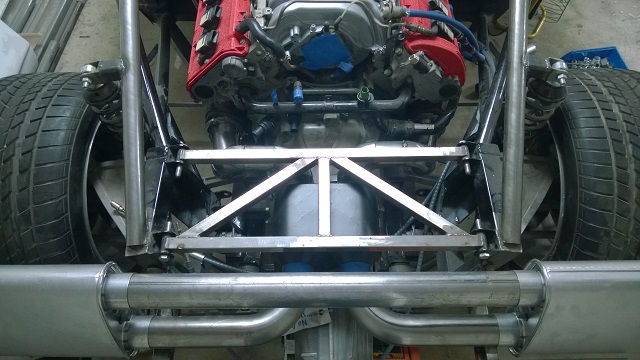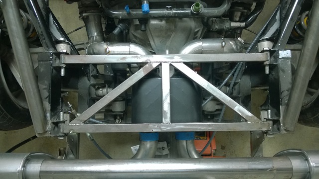 Progress on the exhaust system. Two exhaust tips will exit the center cross pipe in conventional license plate location through the mesh grill in the body. I went with a solid cross pipe initially for ease of fabrication. The pieces are only tack welded together. I plan to remove them as a single assembly for welding and then weld exhaust hangers.