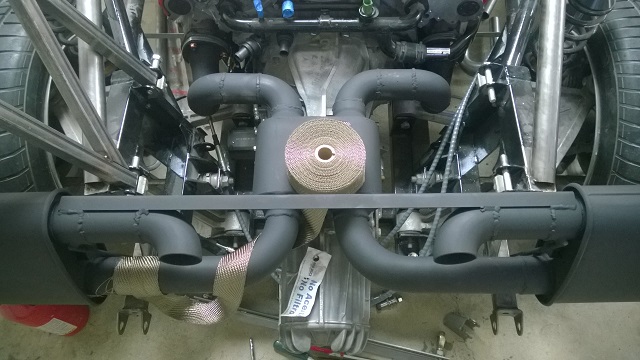 I welded all the exhaust seams. It’s not my best looking welding but considering how many times I adjusted some of the tubes at least the welding is strong. The exhaust is painted with hi temp paint and installed with gaskets and copper coated flange nuts. The mufflers are supported by rubber isolators at the rear of the chassis. I’m wrapping the exhaust and then I will mount the polished stainless tips.