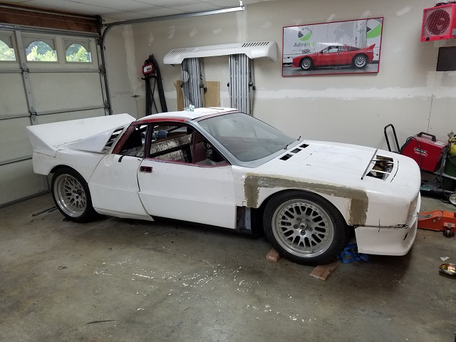 I ground down the rear fiberglass body seams where the spoiler is bonded to the main body panel and I also removed some interior reinforcing ribs that were interfering with the body fit on the steel chassis. I’m going to lay up a thin layer of chopped mat on the spoiler seam for extra reinforcement and then even it out with a skim coat of body filler. After I attach the rear body at the hinges, I need to cut the fiberglass ‘band’ at the top where it meets the steel body to pull the sides in slightly as the body is about 1/2″ too wide at the C-pillars.
