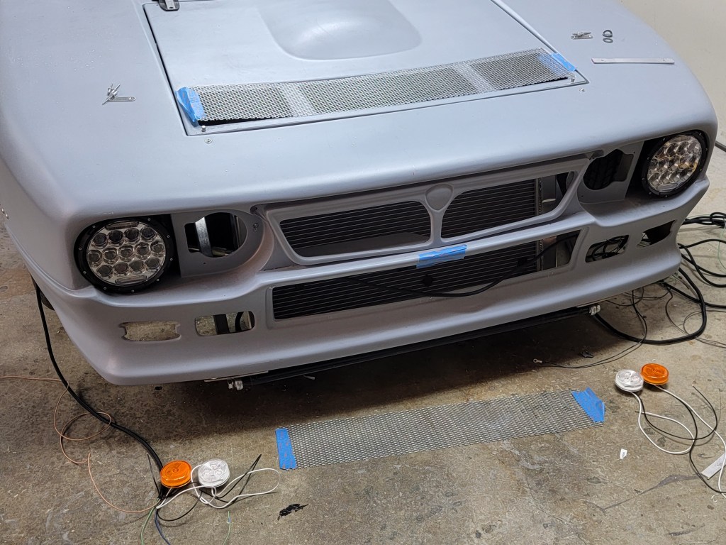I couldn’t find turn signal lights in the original size so I’m assembling something that will give a similar look using clear/amber round lights. I’m still not a fan of the LED headlights but I couldn’t find 7″(175mm) lights that have a rear mount. The housing of the LED headlight has two tapped locations where I was able to attach a bracket, but I don’t like the style. I made hidden brackets for the hood hold-down pins. Grills are cut but I need to paint and attach them. If I can get my garage warm enough this weekend I’ll paint the grills and small parts and glue the rear view mirror bracket to the windshield. I’m using a rear view mirror that displays an image from a roof mounted camera because there is no visibility past the rear wing. I ordered a fin-style GPS antenna housing for the rear of the roof that I can use for the rear facing camera. I installed a battery hold down bracket and mounted the radiator in rubber isolators.