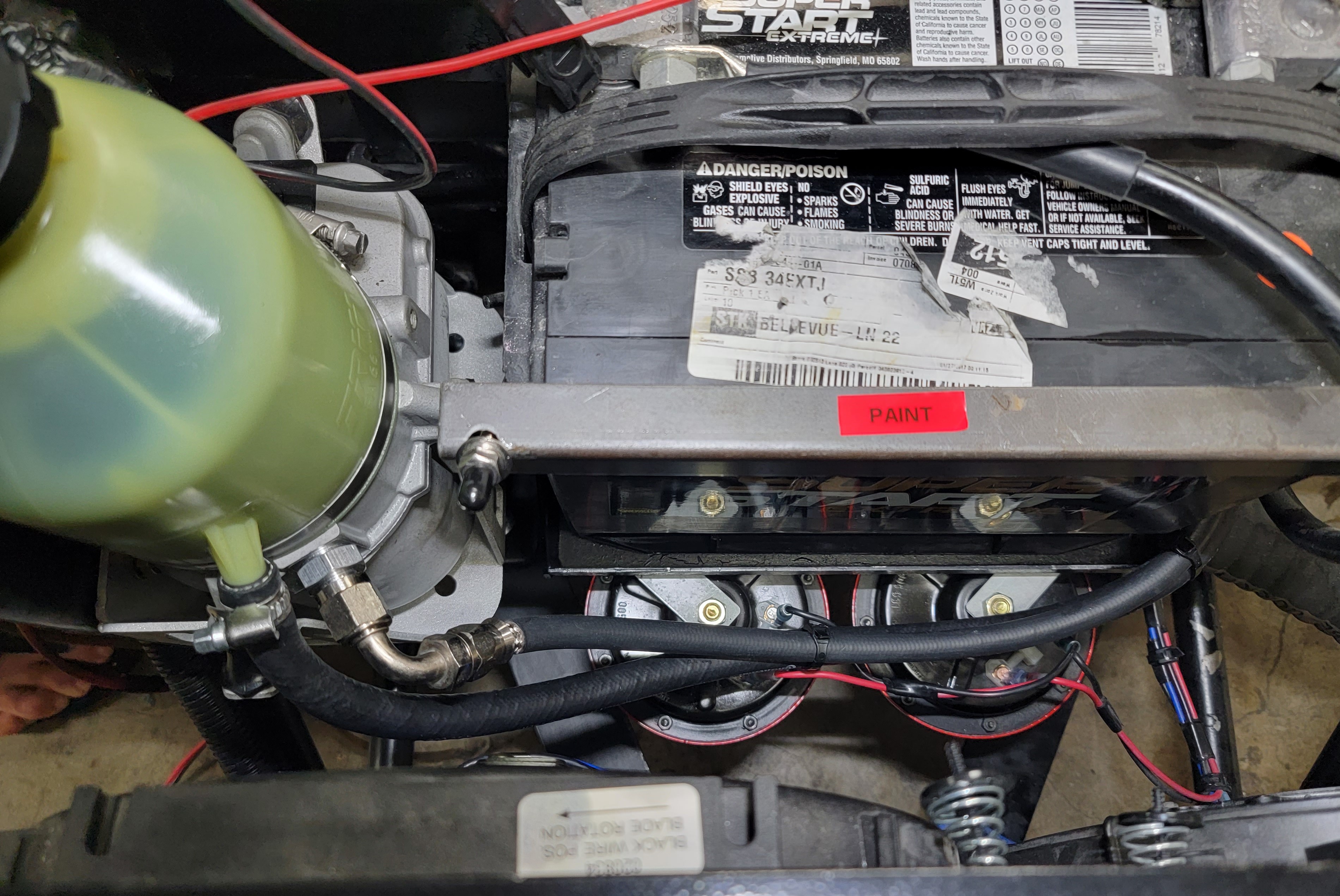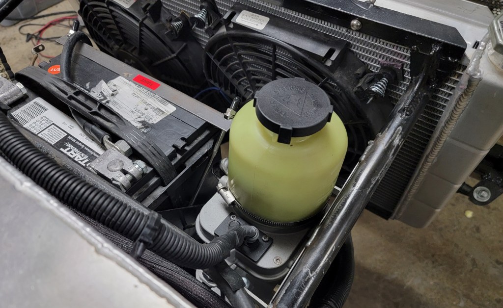 I tested the steering pump using alligator clips to the battery and it works and is easily able to turn the wide R-compound tires. I’ll finish the wiring once I have a circuit breaker of the correct rating.