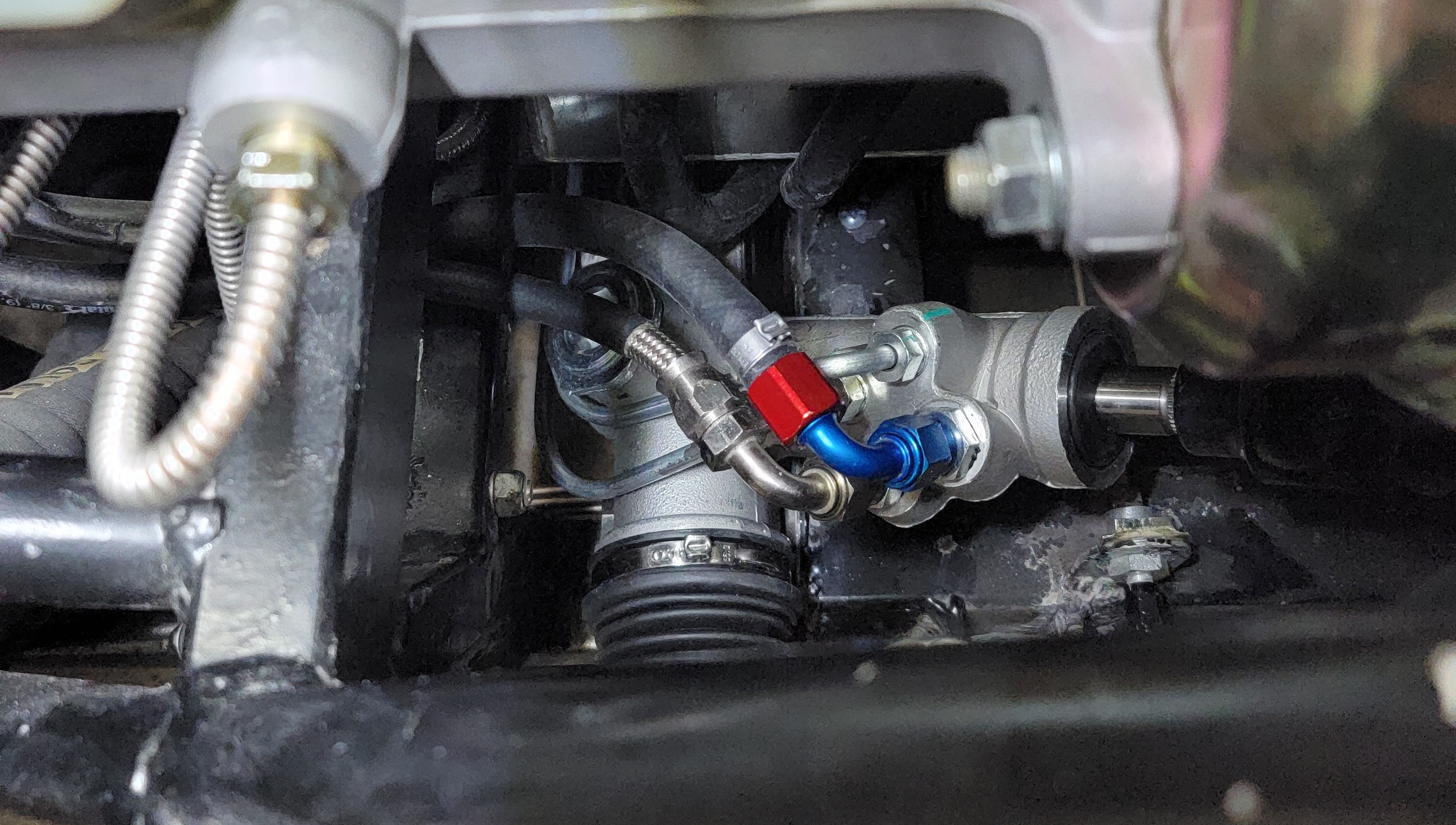 I installed a new quick ratio power steering rack. The ‘refurbished’ rack I got from eBay for mockup was sprayed black (including the used tie rod boots) but there was little evidence that anything else was replaced and the inner tie rods felt worn. On the side of caution since I was installing a new steering pump, I bought a new steering rack to avoid the risk that there was contamination in the rack. I installed the electric power steering pump and made a pressure line using Russell Powerflex braided hose and stainless ends. I covered the line in heavy duty heat shrink so that the stainless braid wouldn’t wear through anything if it was rubbing. For the low pressure return I used a barbed fitting I had lying around from another project.