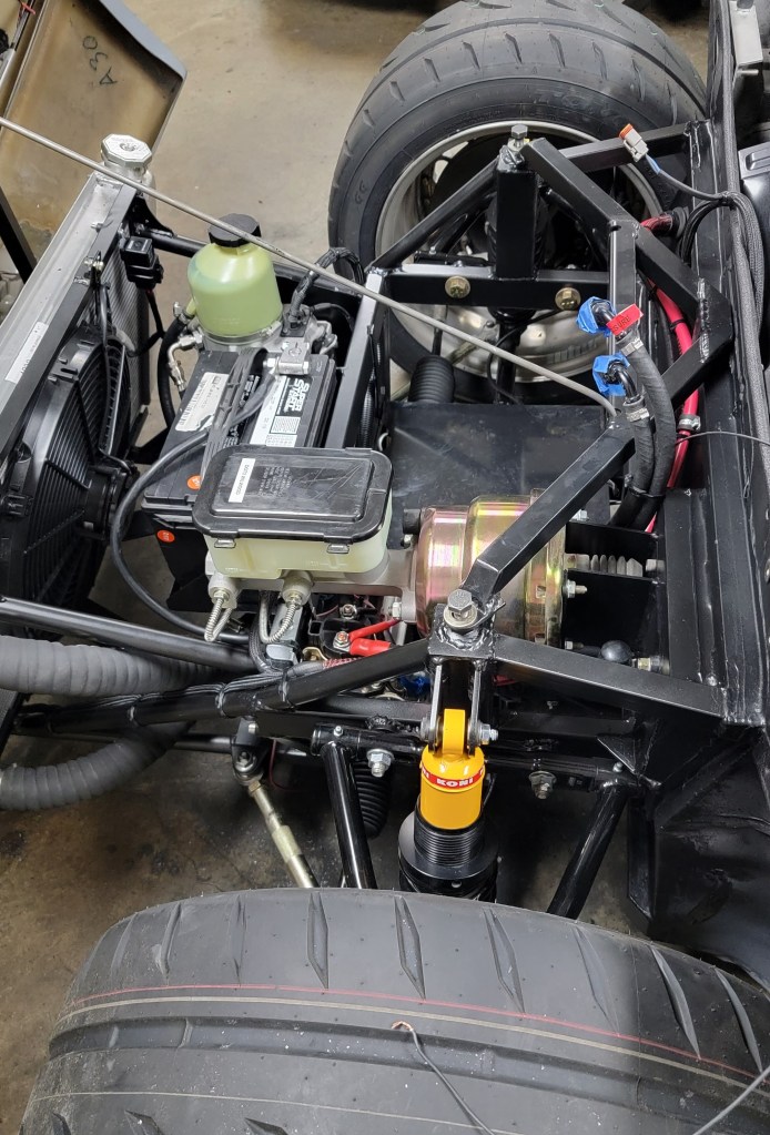 I spent the last four days repainting the front chassis. On reassembly I tidied up the wiring and fasteners, using stainless fasteners where possible for better appearance. I mounted a Spal 16″ fan to improve low speed cooling. When I rewired the car, a goal was to centralize all the relays, fuses and circuit breakers on the Leash relay board inside the car. The electric steering pump draws up to 70 amps and the Spal fan requires 30 amps so instead of running that load through the Leash board, I installed a 100 amp circuit breaker and fan relay up front where they pull power directly from the battery. I consolidated the main battery cable, chassis wiring and vacuum booster line into a single bundle behind the fuel tank for a cleaner appearance.