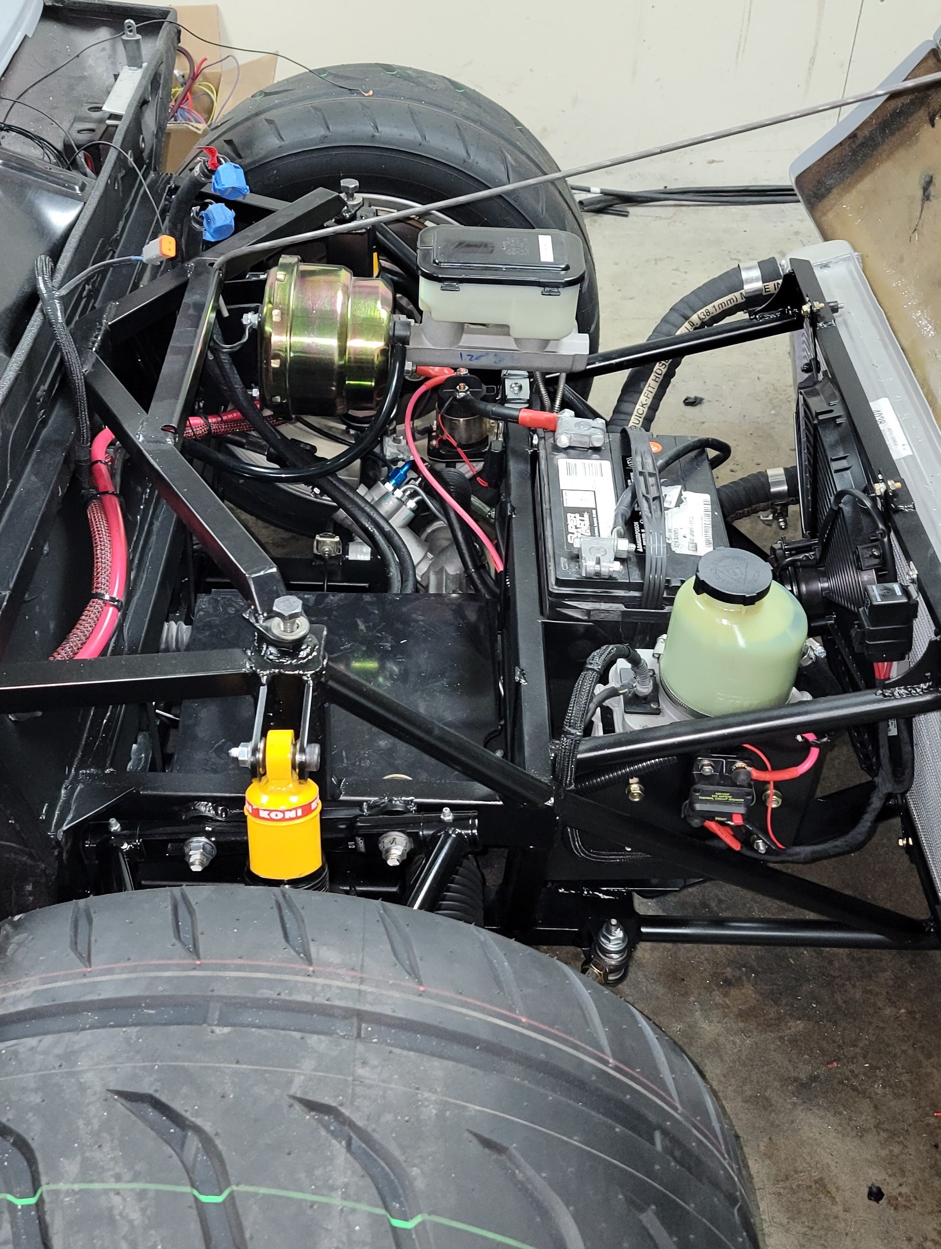 I spent the last four days repainting the front chassis. On reassembly I tidied up the wiring and fasteners, using stainless fasteners where possible for better appearance. I mounted a Spal 16″ fan to improve low speed cooling. When I rewired the car, a goal was to centralize all the relays, fuses and circuit breakers on the Leash relay board inside the car. The electric steering pump draws up to 70 amps and the Spal fan requires 30 amps so instead of running that load through the Leash board, I installed a 100 amp circuit breaker and fan relay up front where they pull power directly from the battery. I consolidated the main battery cable, chassis wiring and vacuum booster line into a single bundle behind the fuel tank for a cleaner appearance.