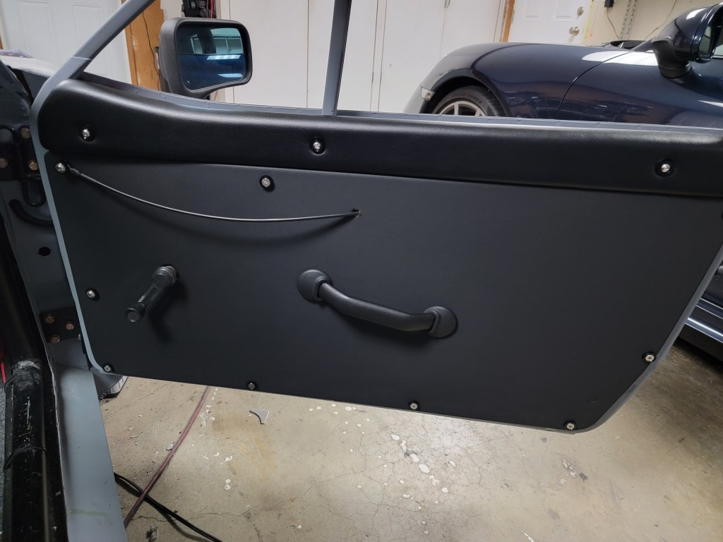 It probably isn’t a huge issue, not having some sort of pivot, but since the outside door release is electric, I need the inside release mechanism to be 100% reliable. I climbed out once through the window opening and with the full containment seat, it’s not something I want to try again. So I went with a very simple door release cable. There is really nothing to fail with this design and it doesn’t look out of place with the performance-oriented interior. I will install black oval eyelets in the door cards where the release cables pass through. I used the RS-style door handles and they work well.