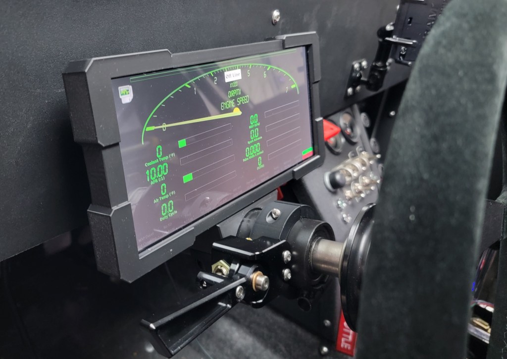 The mount for the display panel is complete. With a full Linux OS on the Raspberry PI, I can run TunerStudio which does a lot more than display engine data. The self-tuning feature will help dial in the fuel maps as I drive, diagnostic data will help with troubleshooting, and I can log engine operating parameters.